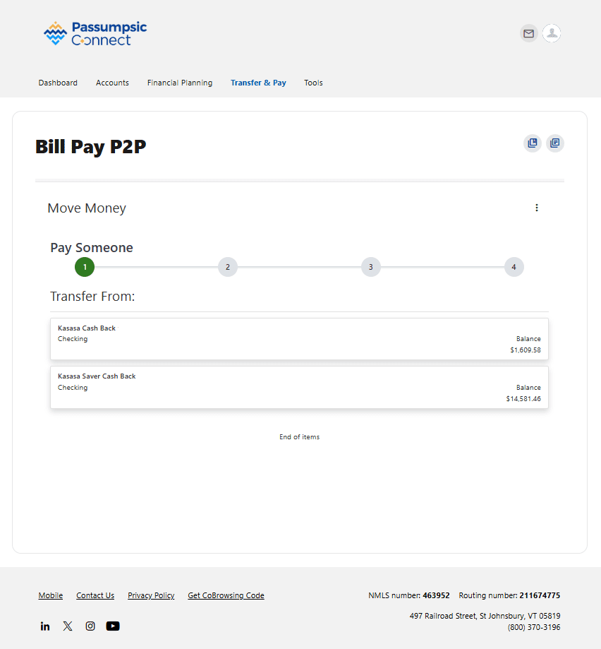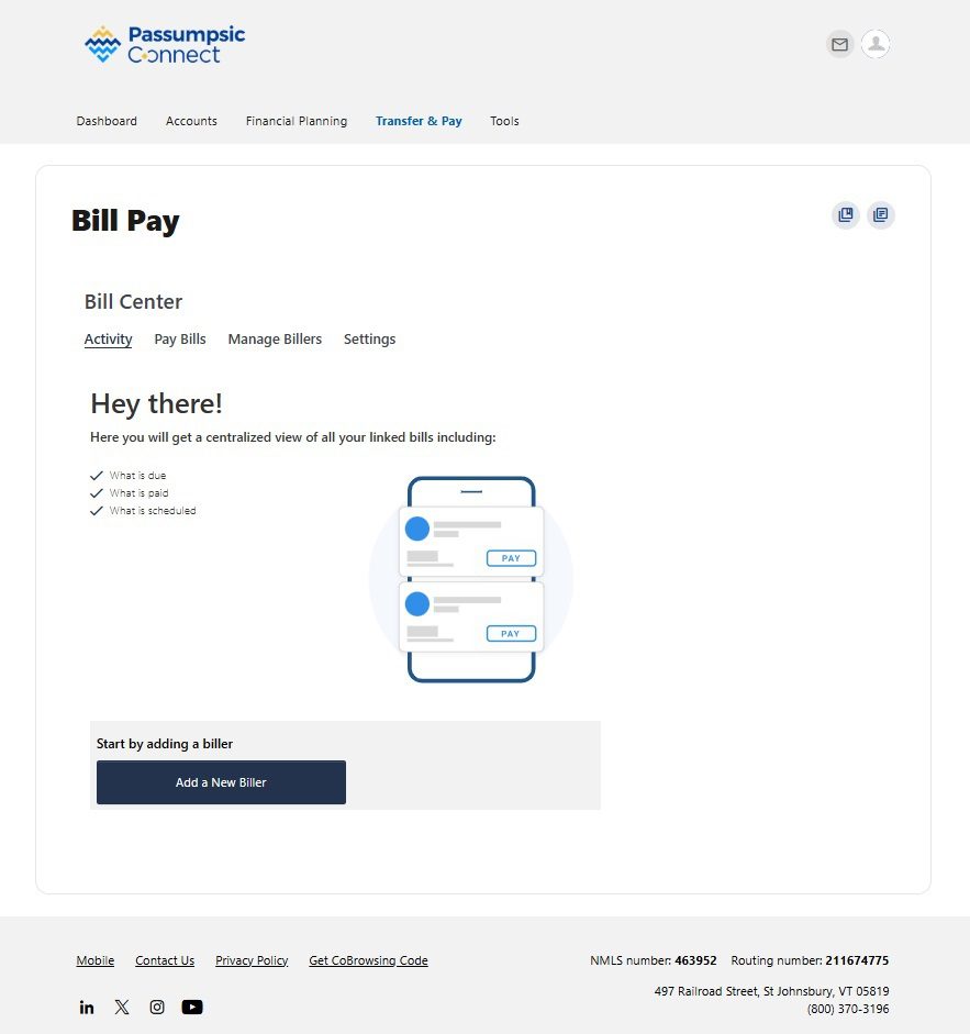 Bill Pay is a secure service that allows users to pay bills or transfer funds directly through Passumpsic Connect, making it a centralized, convenient tool for managing monthly expenses.
