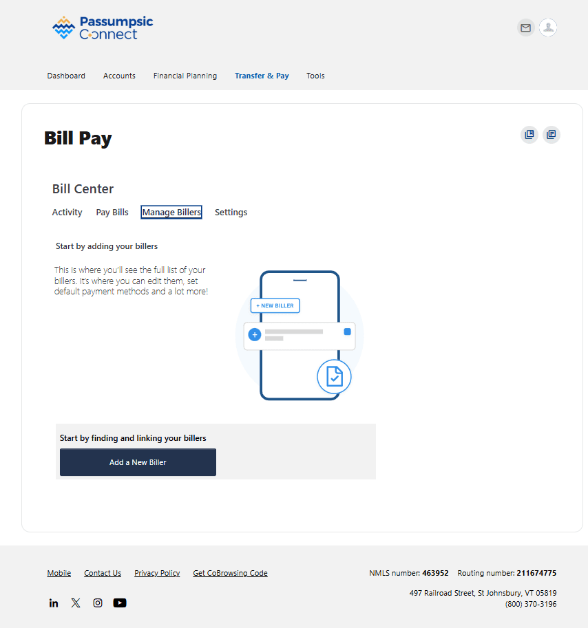 To access Bill Pay please login to your Passumpsic Connect account. Go to the Transfer & Pay tab and select Bill Pay from the drop down menu.